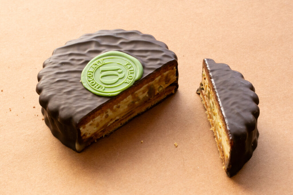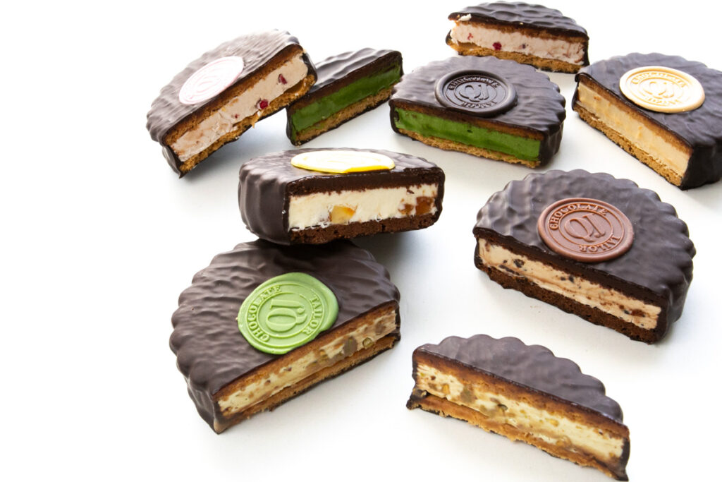 表面をベルギー産のチョコレートコーティングした常温保存可能のチョコサンドです。